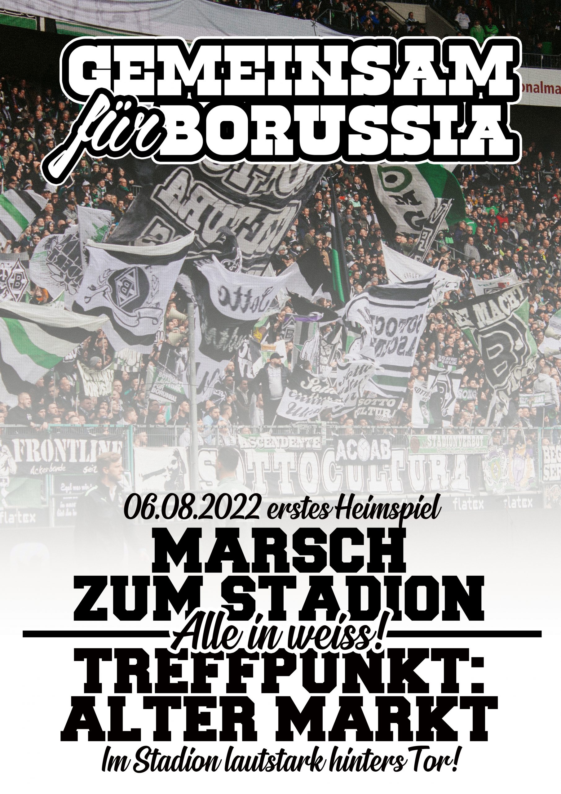 Nun sind es also nur noch 2 Tage bis die Bundesliga in ihre 60. Saison startet. Wir hoffen sehr, dass Borussia den positiven Eindruck aus dem Pokal bestätigen kann und direkt die ersten drei Punkte im Heimspiel gegen Hoppenheim einfahren kann. Der Tag beginnt für viele mit dem Fanmarsch und dem Treffen um 10 Uhr auf dem alten Markt. Bitte versucht alle in weiß zu kommen, um ein einheitliches Bild zu haben. Für alle anderen öffnet das FanHaus um 11 Uhr seine Tore, um endlich wieder alt gewohnt den Spieltag einzuläuten. Das Wetter sieht gut aus und schreit förmlich nach Bier im Biergarten! Natürlich gibt es auch viele neue Artikel in unserem Shop im FanHaus und auch im Stadion. Harald Röbers startet ebenfalls mit seinem FanHaus Imbiss in die neue Saison. Wir hoffen auf einen schönen Tag im und um das FanHaus!