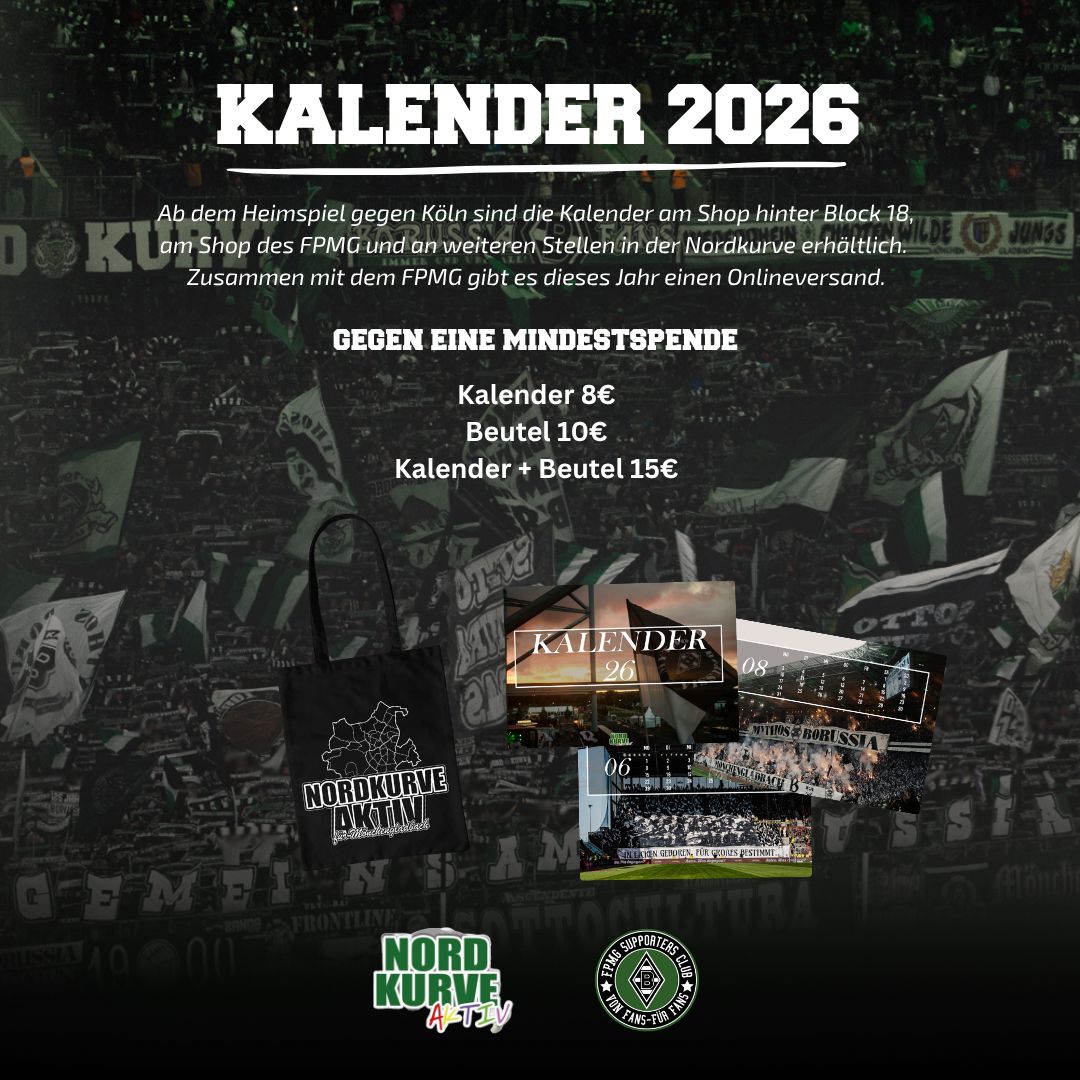 Für das Jahr 2026 bieten wir ab Samstag vor Ort, und auch online, wieder einen Kalender und einen Beutel in Zusammenarbeit mit Nordkurve Aktiv an. Der Erlös geht komplett in die Spendenkasse. Der Kalender ist gegen eine Mindestspende von 8 Euro, der Beutel für 10 Euro, oder beides zusammen für 15 Euro am Stand hinter Block 18, im FPMG Infostand und dem FPMG Shop im FanHaus erhältlich. Dazu kann er nun auch online mit Versand in unserem Shop bestellt werden: Hier geht es zum Shop Bestellbar bis zum 01.12.25 und Zustellung im Laufe des Dezembers.